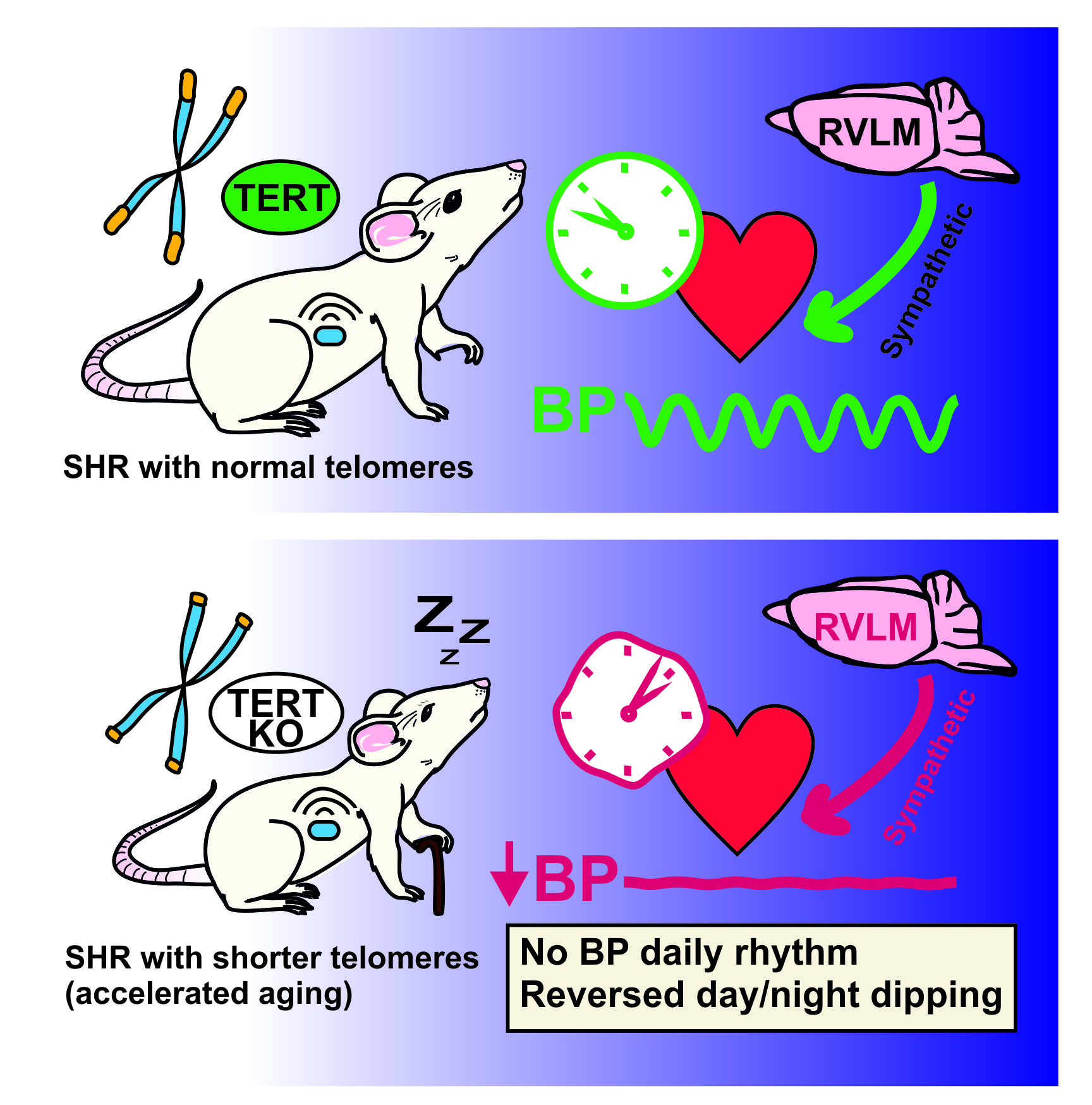 In this work, researchers generated a genetically modified line of spontaneously hypertensive rats lacking the Tert gene. By the third generation, these animals exhibited shortened telomeres in the cells of the heart, liver, kidneys, and other tissues. The rats showed signs of accelerated ageing—they had lower body weight, reduced physical fitness, and elevated oxidative stress in cardiac tissue. While the central circadian clock in the suprachiasmatic nuclei of the brain remained unaffected, deletion of Tert influenced blood pressure regulation by altering the activity of brainstem neurons that control sympathetic innervation of the heart, and consequently the rhythm of the cardiac clock. The study, carried out in collaboration among three research IPHYS laboratories (the Laboratory of Biological Rhythms, Laboratory of Genetics of Model Diseases, and Laboratory of Experimental Hypertension), bridges the fields of chronobiology, aging, and hypertension. It offers new insight into why the nocturnal drop in blood pressure, which is associated with elevated cardiovascular risk, often disappears in elderly patients. It also provides the first evidence for a possible molecular mechanism underlying the age-related deterioration of temporal regulation of physiological functions, including the daily rhythm of blood pressure.
